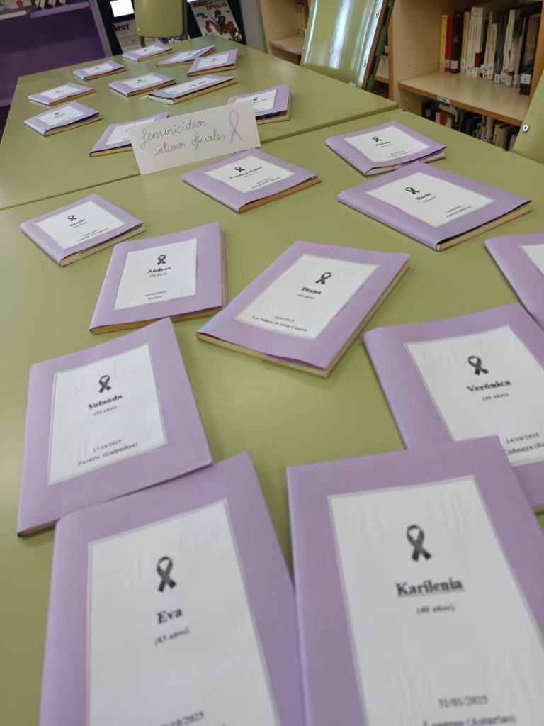 Desde la biblioteca hemos preparado una exposición especial: cada libro representa a una de las mujeres asesinadas este año por violencia de género. Junto a ellos, carteles explicativos que nos llaman a no mirar hacia otro lado.