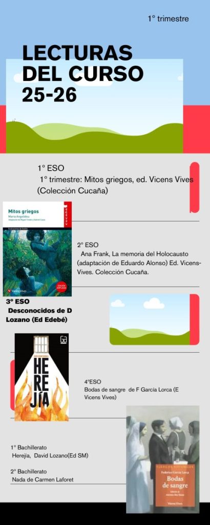 El IES Monegros Gaspar Lax, para fomentar el hábito lector, ha decidido que los alumnos de 1º de ESO a 1º Bachillerato tendrán que leer un libro en verano del cual realizarán una prueba de comprensión a lo largo de la primera semana del próximo curso y que contará para nota. Deberán adquirir el libro correspondiente al curso que han acabado y, en el caso de tener dudas de si se pasa de curso o se repite, la lectura del curso al que deberían acceder. Los alumnos que están repitiendo y ya se hayan leído el libro oportuno el verano anterior, se leerán el libro que aparece en el apartado B. Cualquier duda, hablad con la profesora de lengua o la jefa del departamento. Las lecturas son las siguientes: