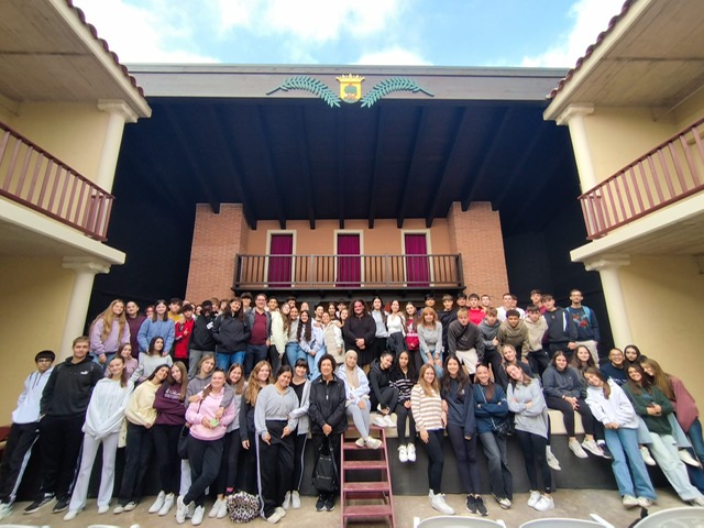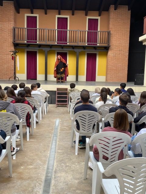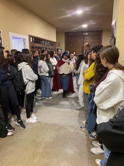 A continuación nos esperaban los alumnos del IES de Almudévar con sus profesores y el director del Teatro de Robres, Luis Manuel Casaus así como Roberto Nistal, el actor de dicho teatro para entrar juntos al Corral donde los alumnos vieron en el zaguán dos vídeos sobre los corrales y la construcción del de Robres. Al acabar apareció el “apretador” para mostrar y explicar esta figura en los teatros clásicos.